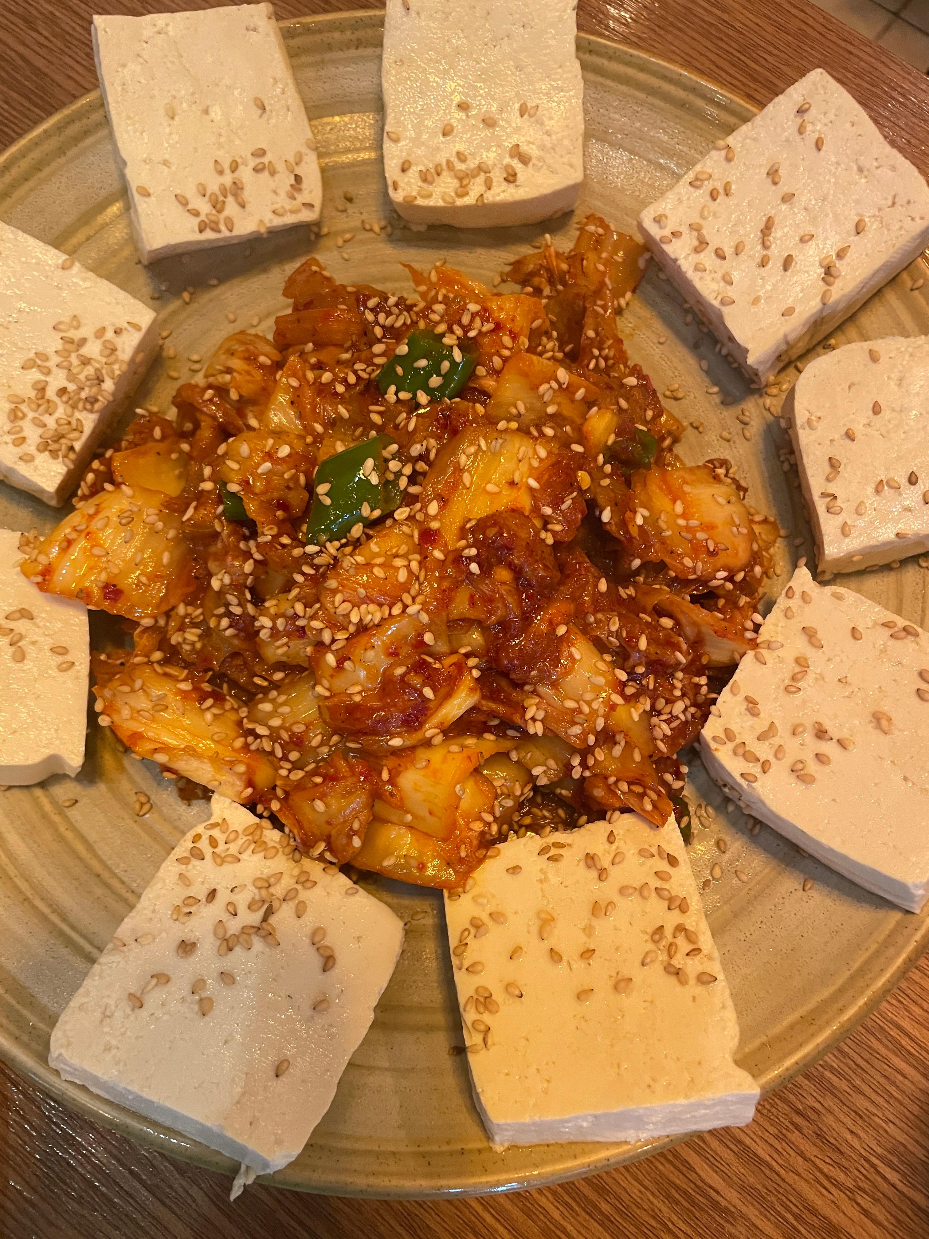 방금 데쳐서 따끈따끈한 두부 위에 새콤한 볶음김치를 얹어서 먹으면