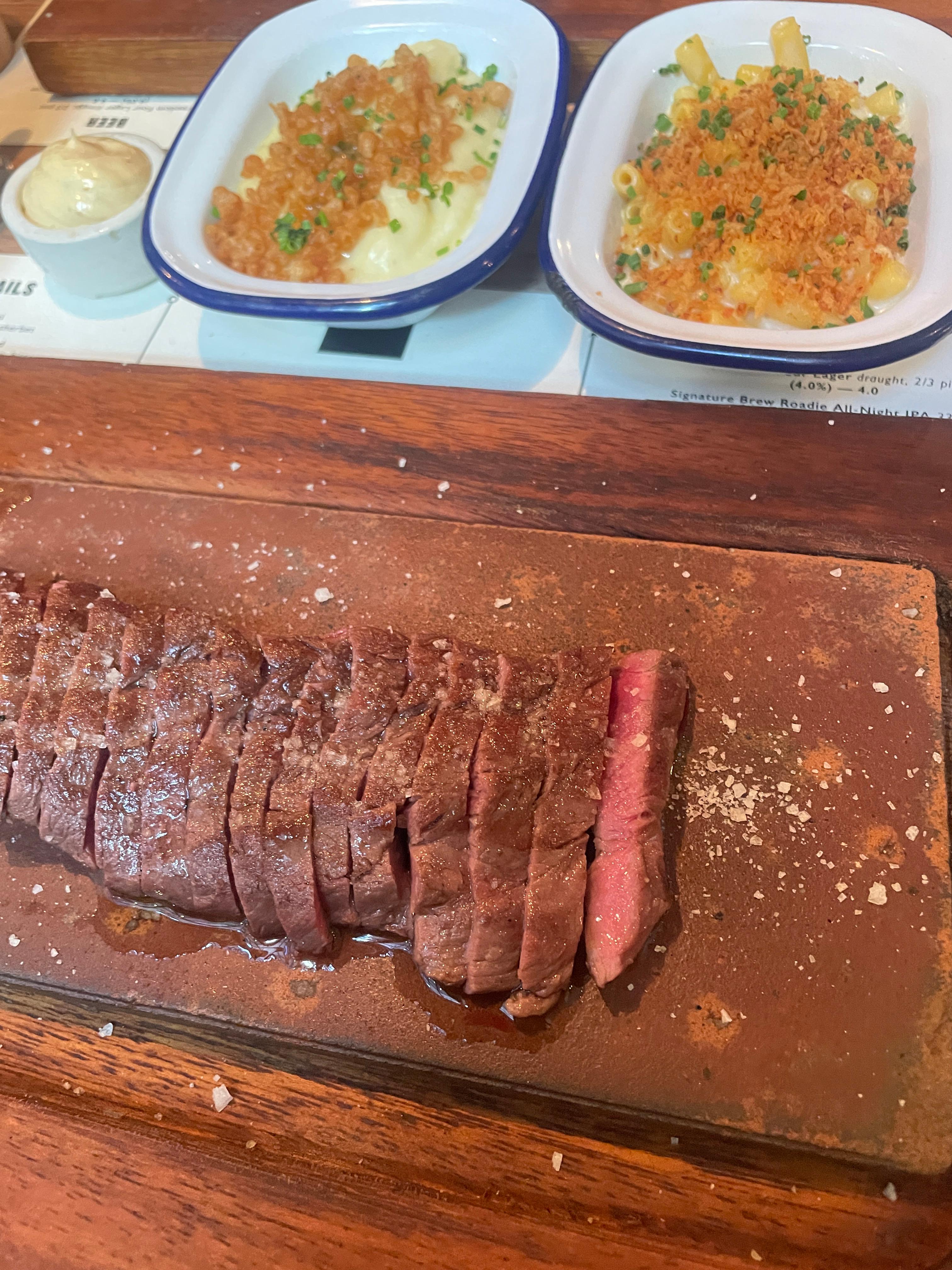 스테이크와 사이드로 본매로우 포테이토, 트러플 마카로니를 시켰습니다